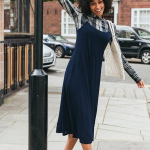 Sleeveless cami dress with ribbed stretchy fabric in a marine blue shade Perfect for layer it over and style with sandals come summertime Relaxed flattering fit and a curved scoop neckline Straight silhouette with midi length Model is 173 cm wearing XS/S Material: 100% Polyester