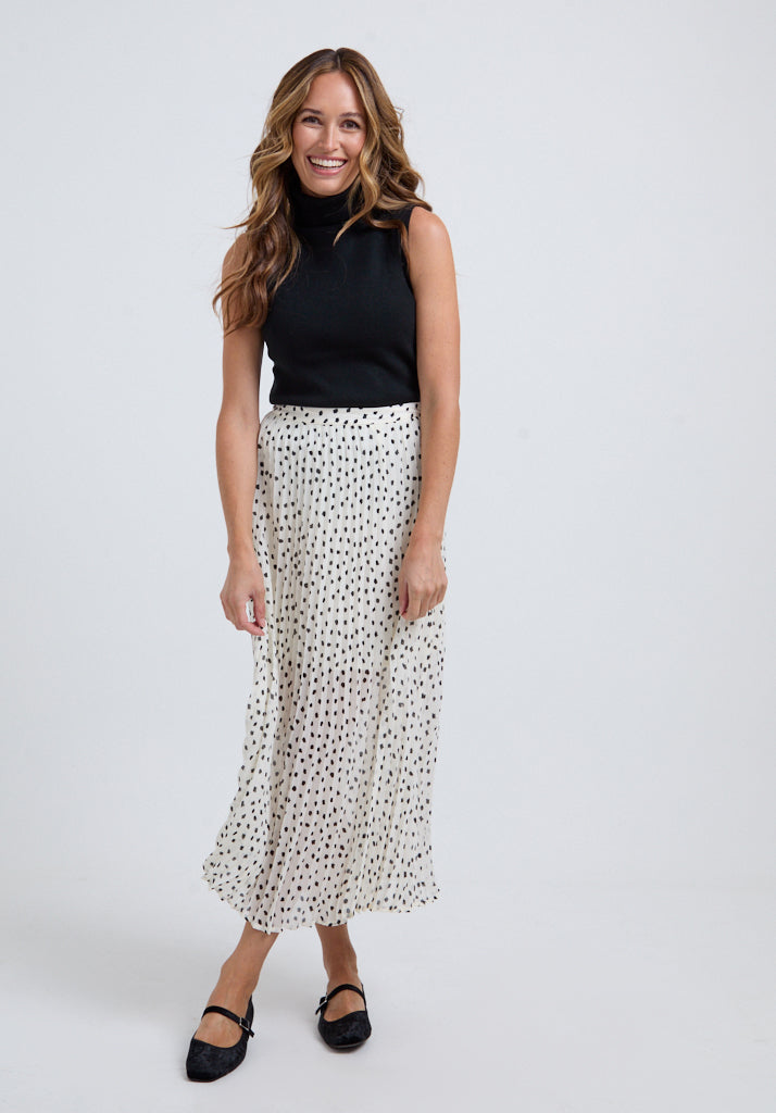 The Nia Skirt by Lily and Lionel is a playful polka dot midi skirt crafted from sheer fabric with a lined interior. Featuring elegant pleating, this skirt combines whimsical charm with sophistication, perfect for adding a touch of fun to your ensemble.